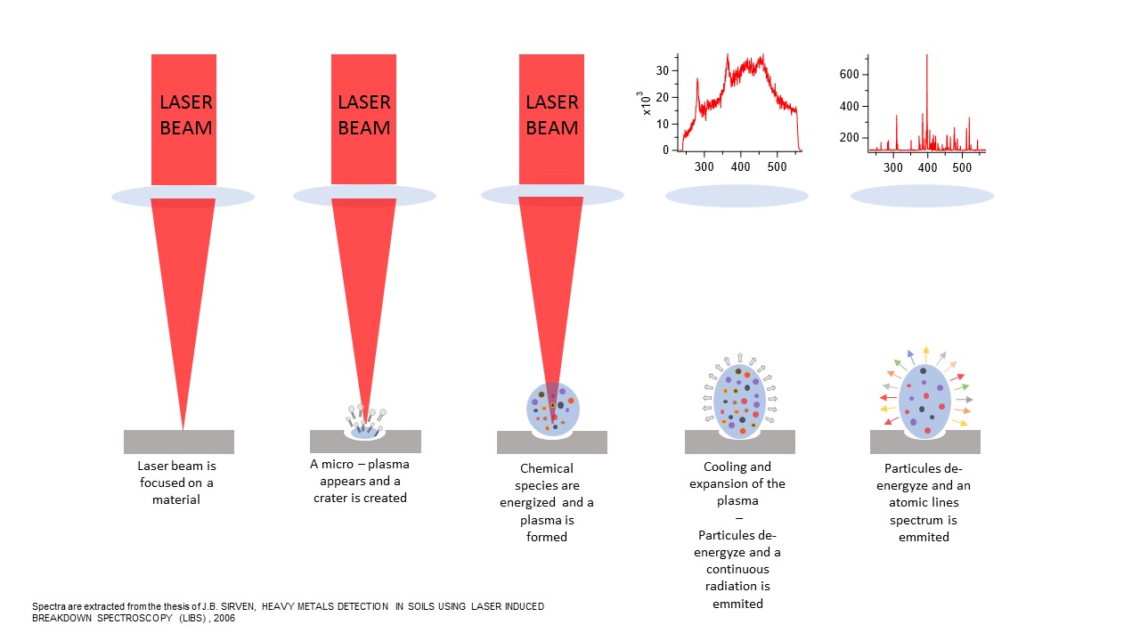 The LIBS analysis consists of interpreting the spectra from the plasma by identifying, using a database, the representative elements of the emission lines. The position of the emission lines indicates the nature of the elements present and their intensities are representative of the concentration of these elements in the plasma which means in the material being analysed.